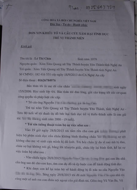 Gia đình chị Chín đã làm đơn tố cáo gửi cơ quan công an huyện Yên Thành cùng các ngành chức năng. Chị Chín nói “Gia đình đưa con đi kiểm tra, phía trung tâm nói cháu bị xâm hại, đề nghị gia đình về công an xã xin giấy đi giám định. Nhưng gia đình đã xin nhiều lần nhưng phía công an nói “bệnh viện huyện nói cháu không bị chi” nên không cho…”.