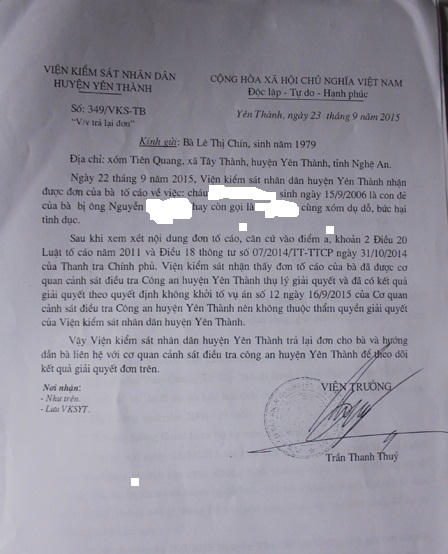 Chị Chín gửi đơn yêu cầu đến Viện KSND huyện, Ngày 23/9/2015, gia đình chị Chín nhận được kết quả của Viện KSND huyện Yên Thành là không thuộc thẩm quyền giải quyết của VKSND.