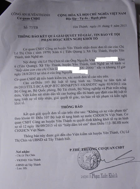 Ngày 16/9, gia đình chị Lê Thị Chín nhận được thông báo kết quả giải quyết vụ việc số 77 của công an huyện Yên Thành, trong đó nội dung nêu rõ: “Không có sự việc phạm tội”, và "Không khởi tố vụ án"