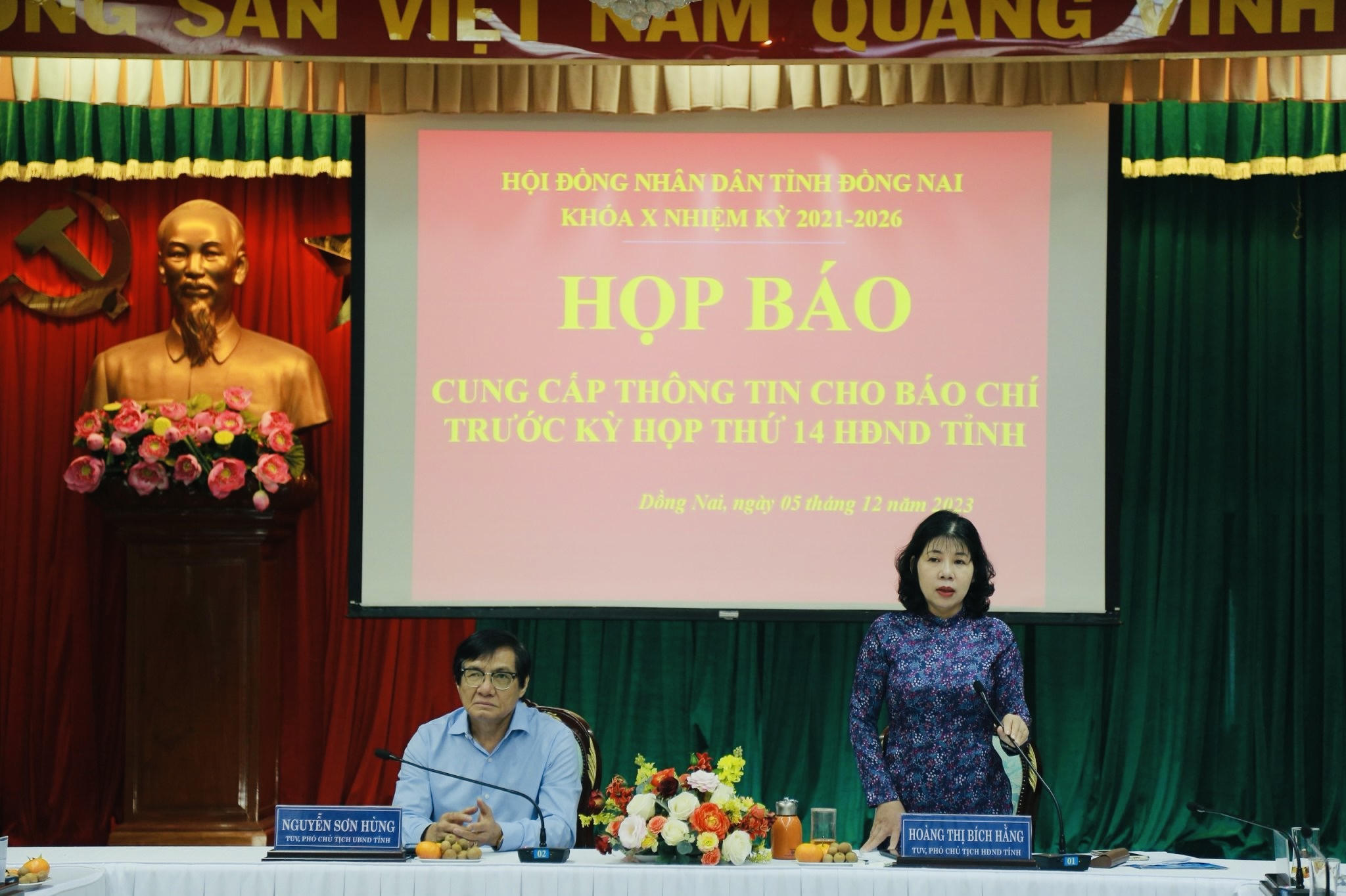 Ngày 5/12, HĐND tỉnh Đồng Nai tổ chức họp báo cung cấp thông tin về kỳ họp thứ 14 (kỳ họp thường lệ cuối năm 2023), HĐND tỉnh khóa X. Chủ trì buổi họp báo có Phó Chủ tịch HĐND tỉnh Đồng Nai Hoàng Thị Bích Hằng và Phó Chủ tịch UBND tỉnh Nguyễn Sơn Hùng.