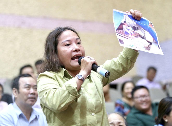 Sau khi có ý kiến của các ĐB QH, cử tri Lê Thị The (ngụ phường Bình An) phát biểu, đề nghị các ĐBQH phải sớm giải quyết các khiếu nại của 115 hộ dân đã ra Hà Nội khiếu kiện và đề nghị Thanh tra Chính phủ (TTCP) lập đoàn thanh tra toàn diện dự án Khu đô thị mới Thủ Thiêm.