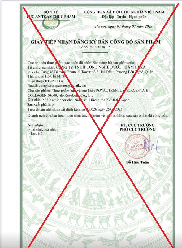 Tuy nhiên, qua tra cứu dữ liệu tại Cục An toàn thực phẩm, đến thời điểm hiện tại, Cục An toàn thực phẩm chưa cấp Giấy tiếp nhận đăng ký bản công bố sản phẩm cho sản phẩm Thực phẩm bảo vệ sức khỏe Royal Premium Placenta & Collagen 30.000. Giấy tiếp nhận đăng ký bản công bố sản phẩm nêu trên có dấu hiệu giả mạo.