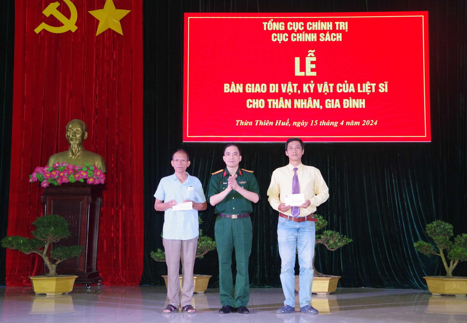 (PLVN) - Ngày 15/4, Cục Chính sách, Tổng Cục Chính trị Quân đội Nhân dân Việt Nam phối hợp với Bộ Chỉ huy Quân sự (CHQS) tỉnh Thừa Thiên Huế tổ chức Lễ bàn giao di vật, kỷ vật của liệt sĩ cho thân nhân của 2 gia đình liệt sỹ tại Thừa Thiên Huế.