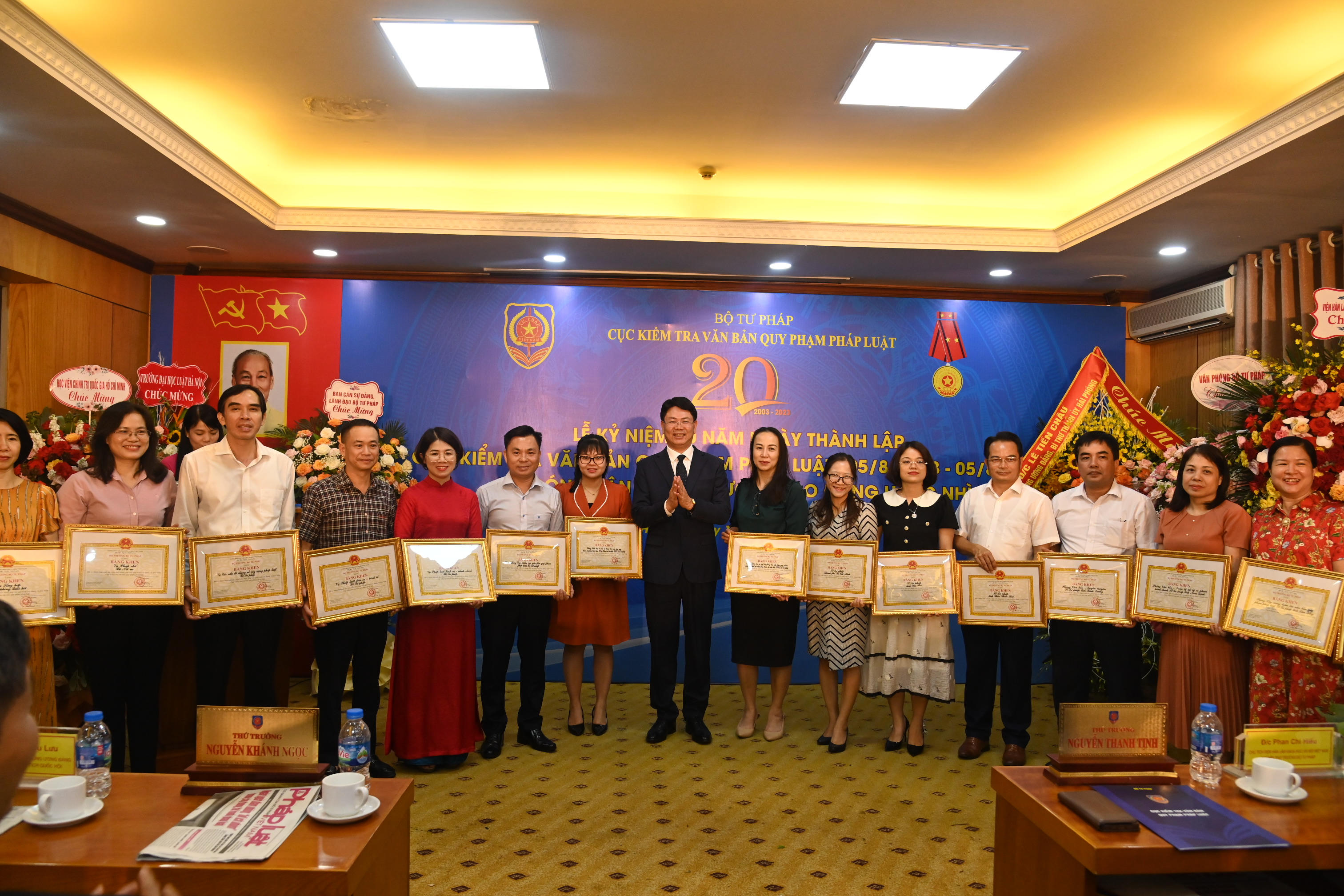 Nhân dịp này, tại buổi lễ, đã công bố Quyết định và trao tặng Bằng khen của Bộ trưởng Bộ Tư pháp cho các 14 tập thể và 17 cá nhân có thành tích xuất sắc, tiêu biểu đóng góp vào quá trình xây dựng và phát triển Cục Kiểm tra VBQPPL.