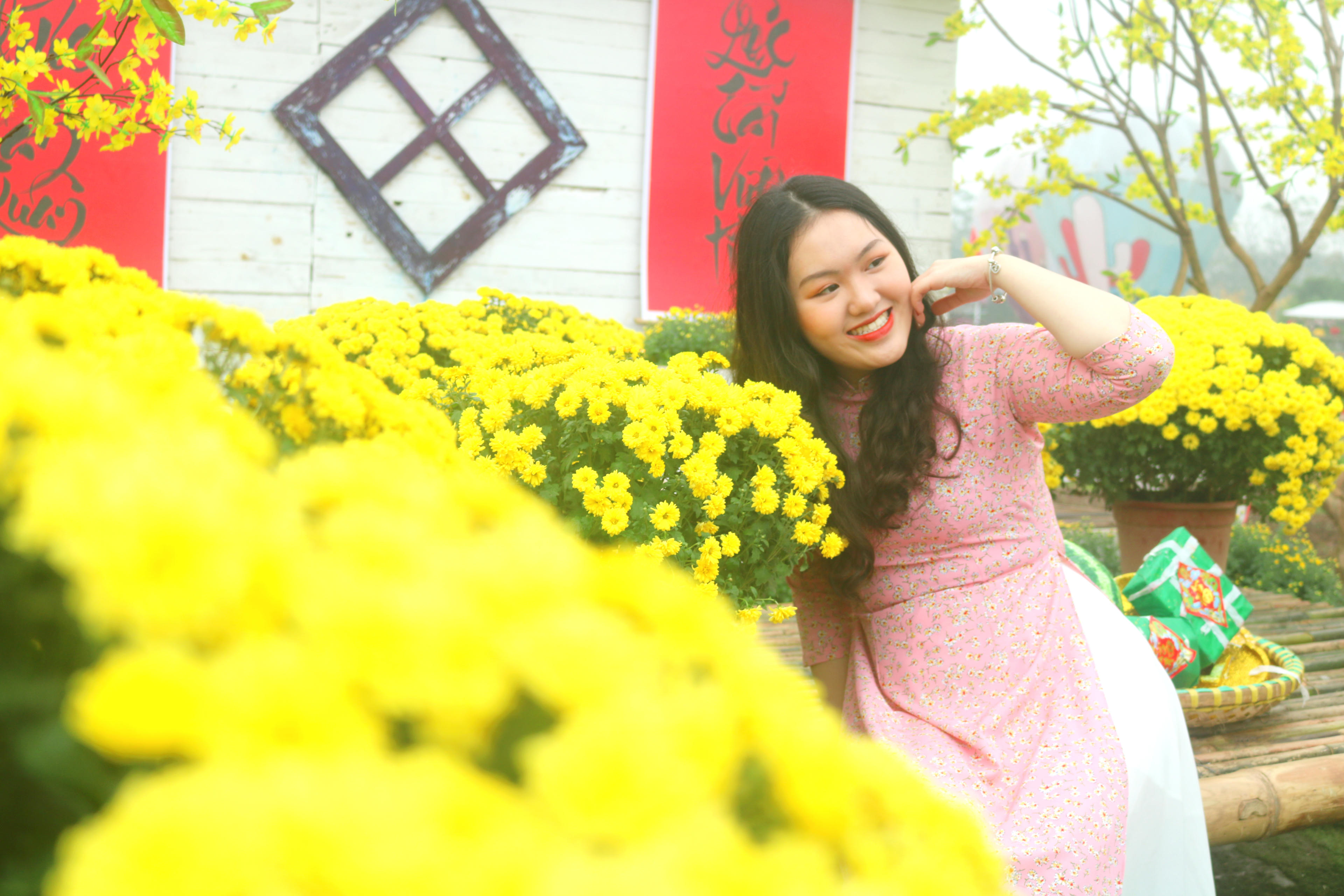 Bên cạnh khu vườn vàng ươm, một số chậu cúc được dùng để tạo bối cảnh chụp ảnh Tết bên những câu đối, cây mai vàng, bánh chưng xanh và mâm ngũ quả