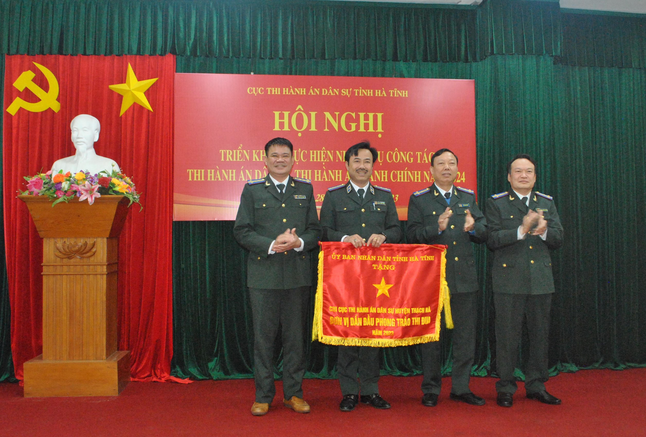 Lãnh đạo Cục THADS Hà Tĩnh trao cờ thi đua đơn vị dẫn đầu năm 2023 của UBND tỉnh Hà Tĩnh cho Cục THADS huyện Thạch Hà. Ảnh: Hữu Anh |