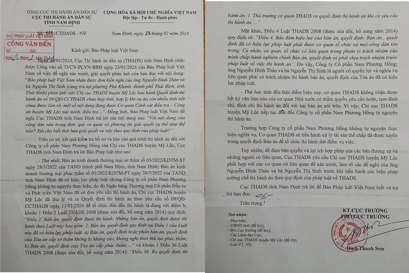 Ngày 22/2/2024, Cục THADS có Văn bản 122/CTHADS-NV trả lời Báo PLVN. Thứ nhất, Bản án 03/2022/KDTM-ST ngày 28/3/2022 của TAND TP Nam Định và Bản án 05/2022/KDTM-PT ngày 30/7/2022 của TAND tỉnh Nam Định đã có hiệu lực pháp luật nhưng Cty Nam Phương Hồng không tự nguyện thực hiện.