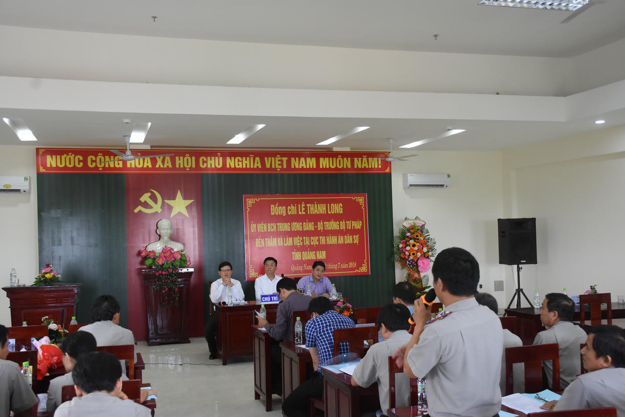 Ngày 12/7, tiếp tục chuyến công tác tại tỉnh Quảng Nam, Bộ trưởng Bộ Tư pháp Lê Thành Long cùng Đoàn công tác đã chủ trì buổi làm việc với Cục THADS tỉnh Quảng Nam; dự Lễ Công bố và trao quyết định giao Quyền Cục trưởng Cục THADS tỉnh Quảng Nam. Ông Trần Văn Tân, Phó Chủ tịch UBND tỉnh Quảng Nam tham dự.