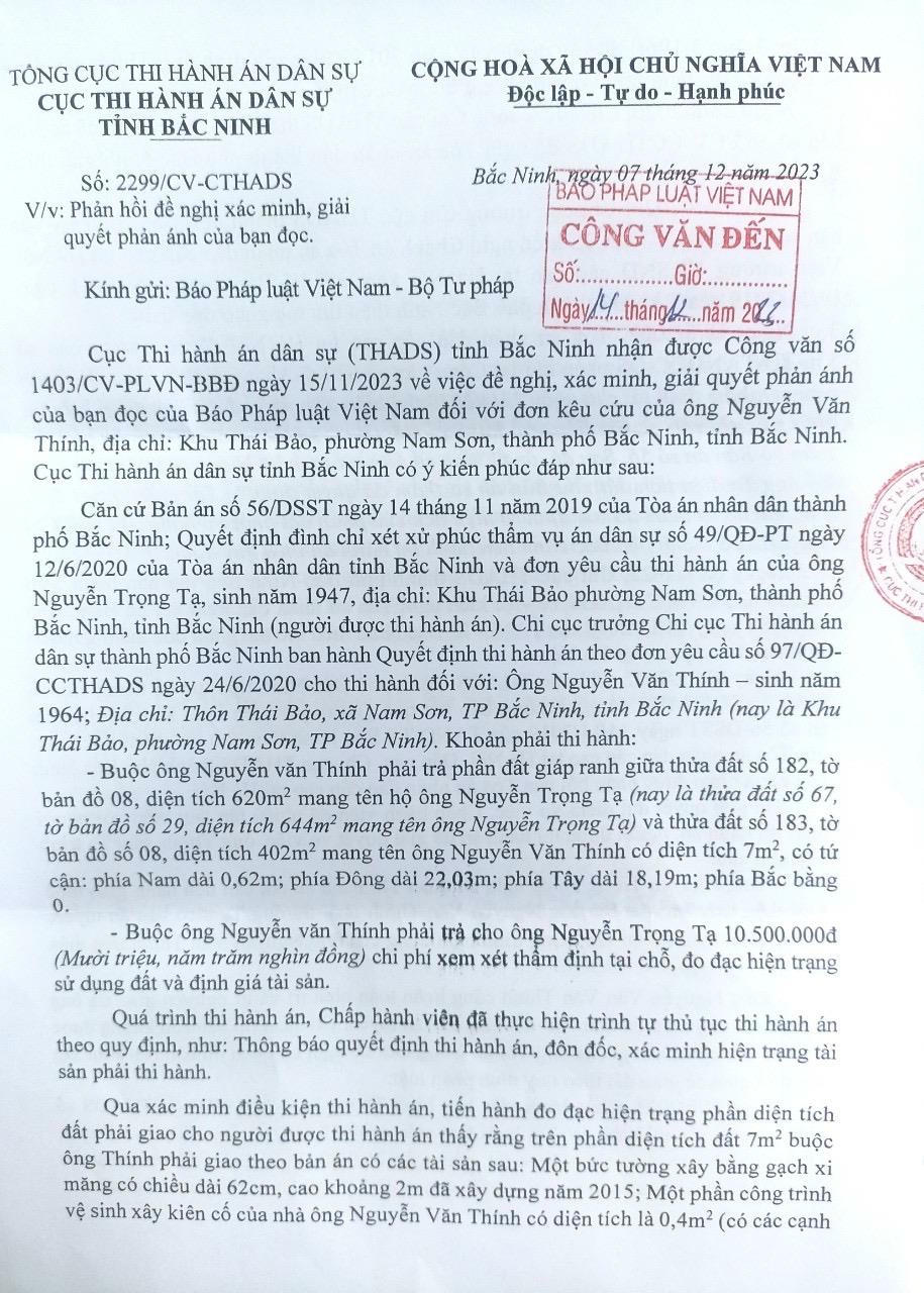 (PLVN) - Báo PLVN vừa nhận được Công văn 2299/CV-CTHADS của Cục Thi hành án dân sự (THADS) tỉnh Bắc Ninh trả lời đơn ông Nguyễn Văn Thính (ngụ khu Thái Bảo, phường Nam Sơn, TP Bắc Ninh) do Báo PLVN chuyển đến.