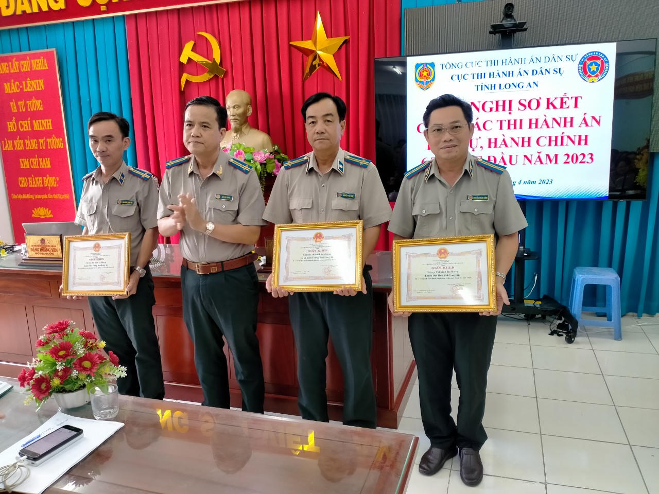 Cục trưởng Cục THADS Long An Bùi Phú Hưng tặng Giấy khen cho các tập thể có thành tích xuất sắc trong công tác 6 tháng đầu năm 2023. |