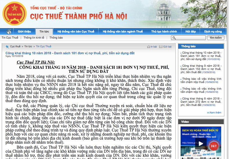 Từ đầu năm 2018 đến nay, Cục thuế Thành phố Hà Nội đã đăng công khai trên trang Website của Cục thuế Thành phố Hà Nội tại địa chỉ http://hanoi.gdt.gov.vn 1.446 đơn vị nợ tiền thuế, phí, các khoản thu liên quan đến đất với tổng số tiền nợ đã đăng công khai là 5.266.065 triệu đồng. Kết quả sau khi đăng công khai đã có 452 Doanh nghiệp và Dự án nộp 250.559 triệu đồng.