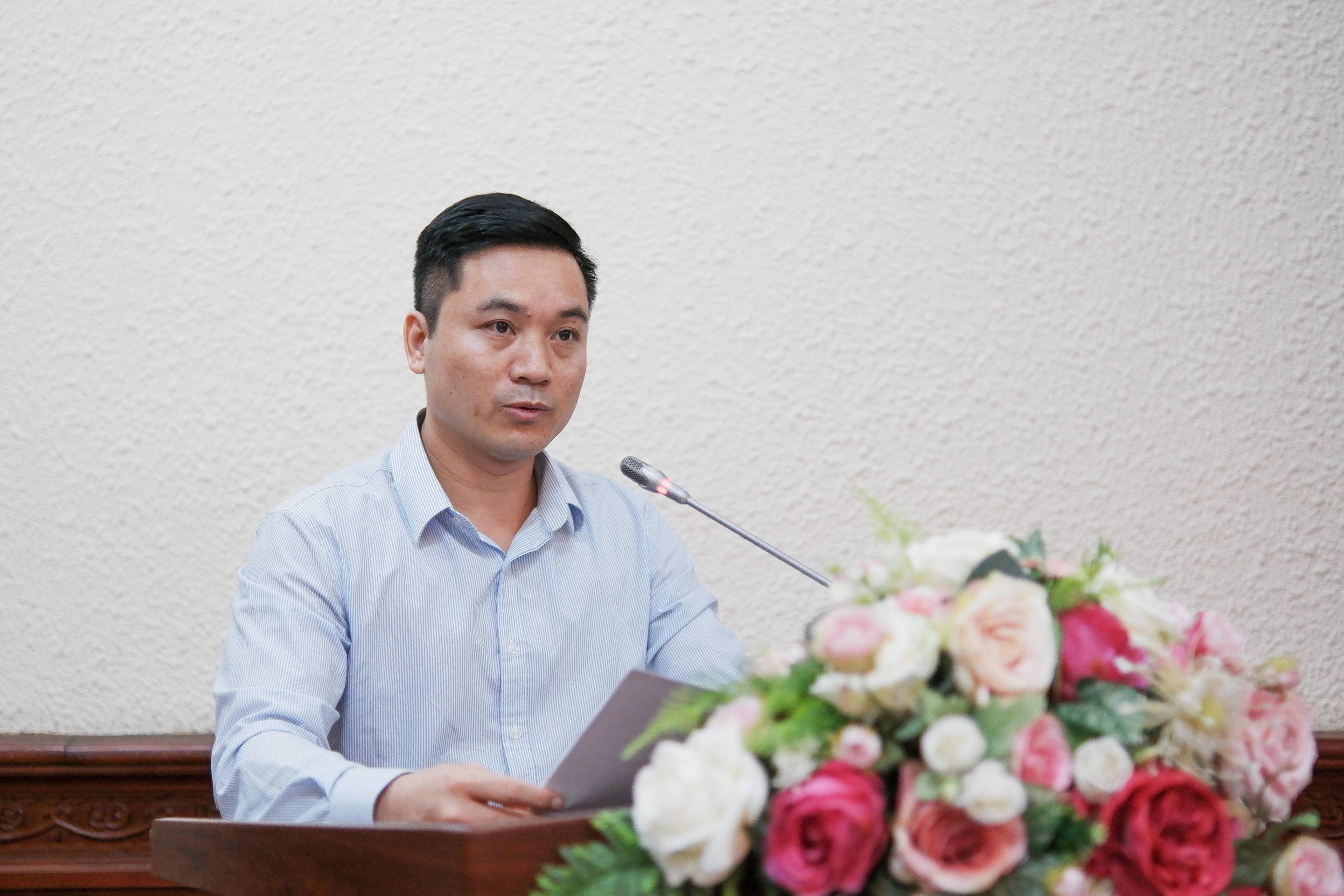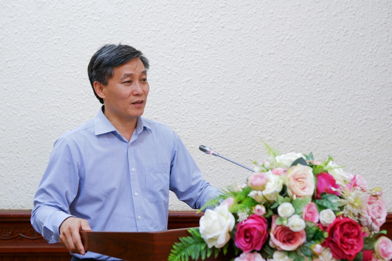 Phó Vụ trưởng Vụ Hợp tác quốc tế Đào Quý Lộc báo cáo tổng kết công tác thi đua, khen thưởng năm 2023 của cụm Thi đua số IV. |