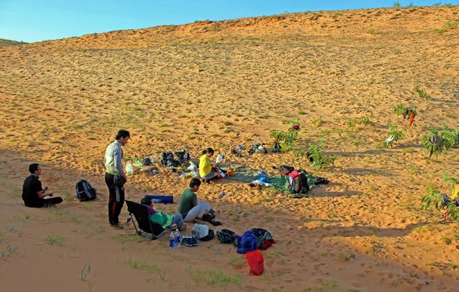 Đêm nướng thịt trên sa mạc, rất thú vị. Không nên uống nhiều rượu vì sẽ khát lắm. Đêm ở sa mạc trời trong vắt, một biển sao bao phủ trên đầu, mở mắt ra là thấy. Ngắm bầu trời sao sáng rực không một gợn mây và mở nghe bài Dust in the wind là một trong những giây phút này không bao giờ quên được.