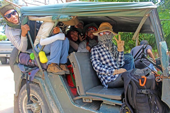 Các bạn có thể chọn "căn cứ điểm" gồm nơi ăn trước và sau khi đi/thuê xe jeep chở ra và đón về tắm rửa nghỉ ngơi. Trong hình là xe jeep chở cả đoàn đi, 8 người và balo cồng kềnh vẫn chở nổi mặc dù hơi chật.