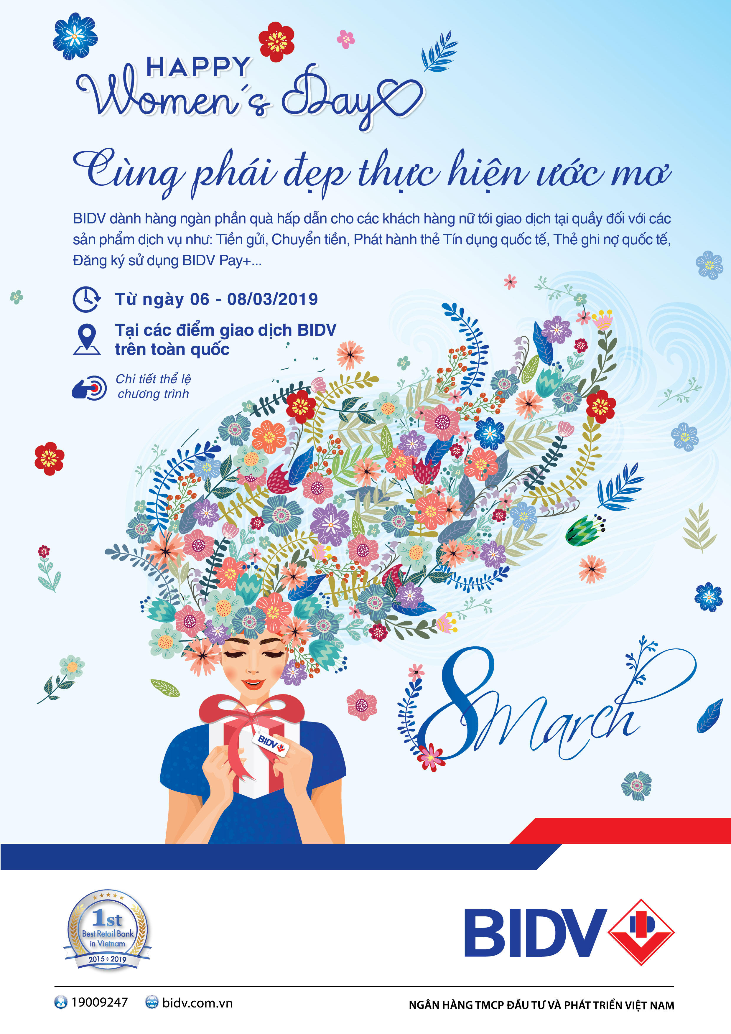 Theo đó, từ ngày 06-08/03/2019, Ngân hàng TMCP Đầu tư và Phát triển Việt Nam (BIDV) triển khai chương trình ưu đãi khách hàng nữ tới giao dịch tại các điểm giao dịch BIDV trên toàn quốc với gần 20.000 quà tặng là tiền mặt, voucher và mã grab hấp dẫn.