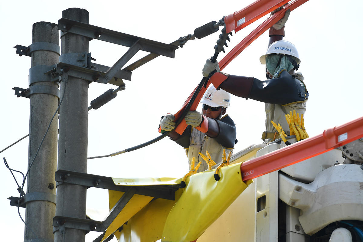 9 giờ sáng, khi nắng bắt đầu rát da cũng là lúc Cao Văn Tới (đội sửa chữa điện nóng thuộc EVN Hà Nội) cùng đồng đội đang miệt mài lắp tấm cách điện, xử lý các điểm tiếp xúc để chuẩn bị đấu nối lưới điện trung thế.