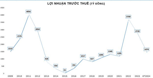 Biến động lợi nhuận của Eximbank trong 15 năm qua. |