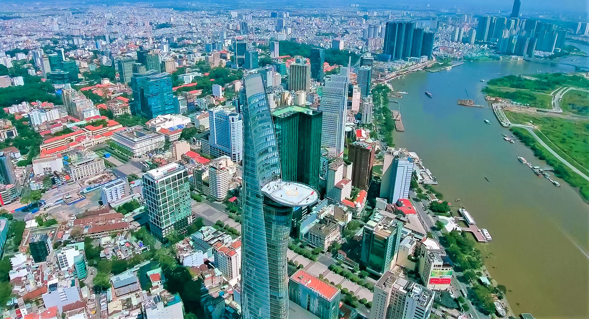 Helipad treo lơ lửng khỏi kết cấu tòa nhà tạo thành hình tượng búp sen đang hé nở bên sông Sài Gòn vô cùng đẹp đẽ và tinh tế. |