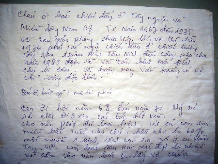 Như nhớ lại ký ức chiến tranh, ông nhìn tôi rồi cặm cụi viết: “Những người chiến đấu trong rừng Trường Sơn năm ấy, nhiều người nhiễm chất độc đi-ô-xin. Nhiều người lấy vợ, sinh con bị dị tật. Còn bác, sau khi xác định bị nhiễm, câm và ….” (ông không muốn nói bị vô sinh nên mới viết 4 dấu chấm. Mãi sau, ông mới viết thật là ông bị vô sinh nên không lấy vợ).