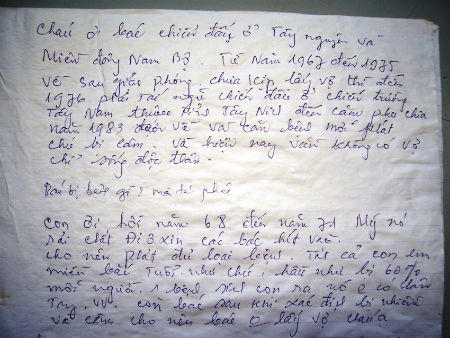 Năm 1983 được xuất ngũ lần hai, có ngờ đâu chất độc đi-ô-xin đã ngấm vào thân thể bác. Phát bệnh, bác bị câm. Đến nay vẫn không có vợ con, sống độc thân”.