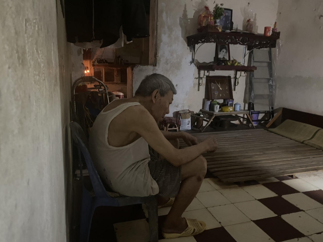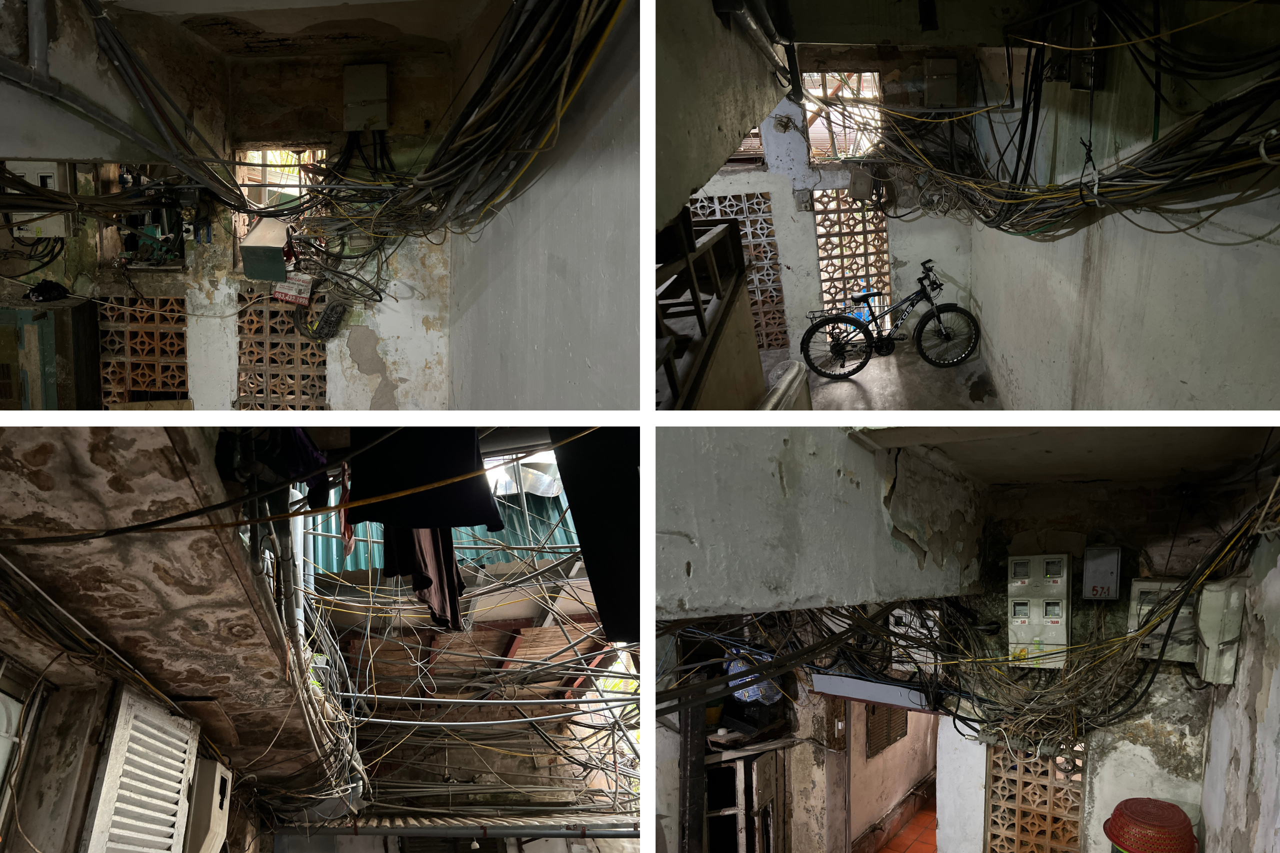 “Xuống cấp lắm rồi, mùa hè thì chật chội, dây điện nhằng nhịt, lo lắng nhất là chỉ sợ quá tải chập cháy. Hôm nào trời mưa thì nhà ai cũng trong tình cảnh nước mưa thấm dột từ trên xuống dưới nên phải dùng đến những chậu, xô để hứng nước” - ông Việt nói.