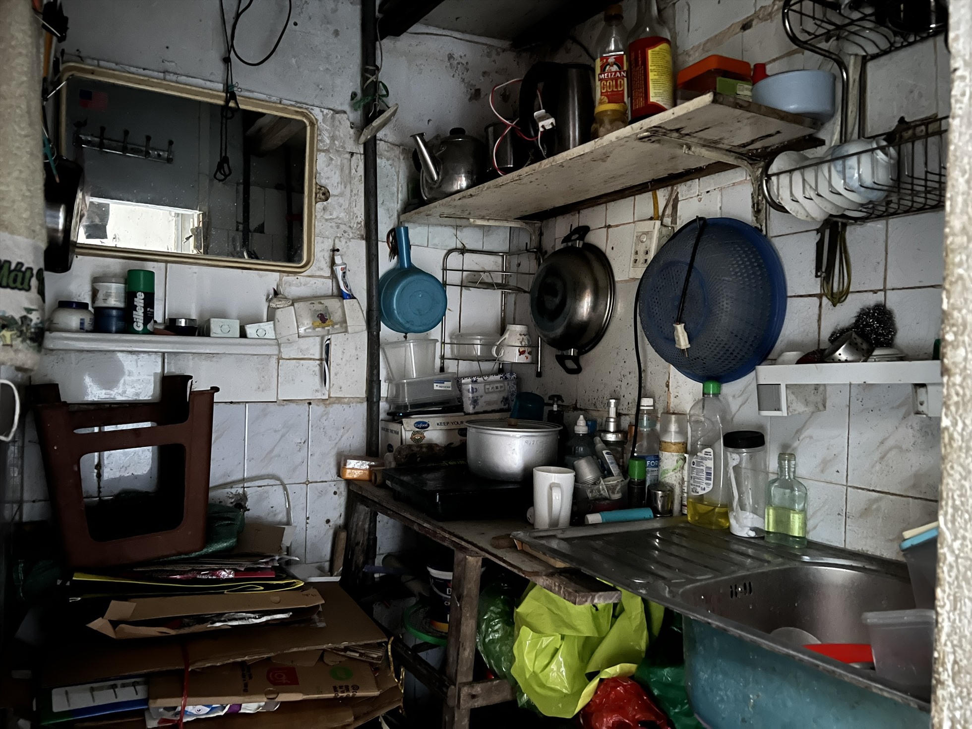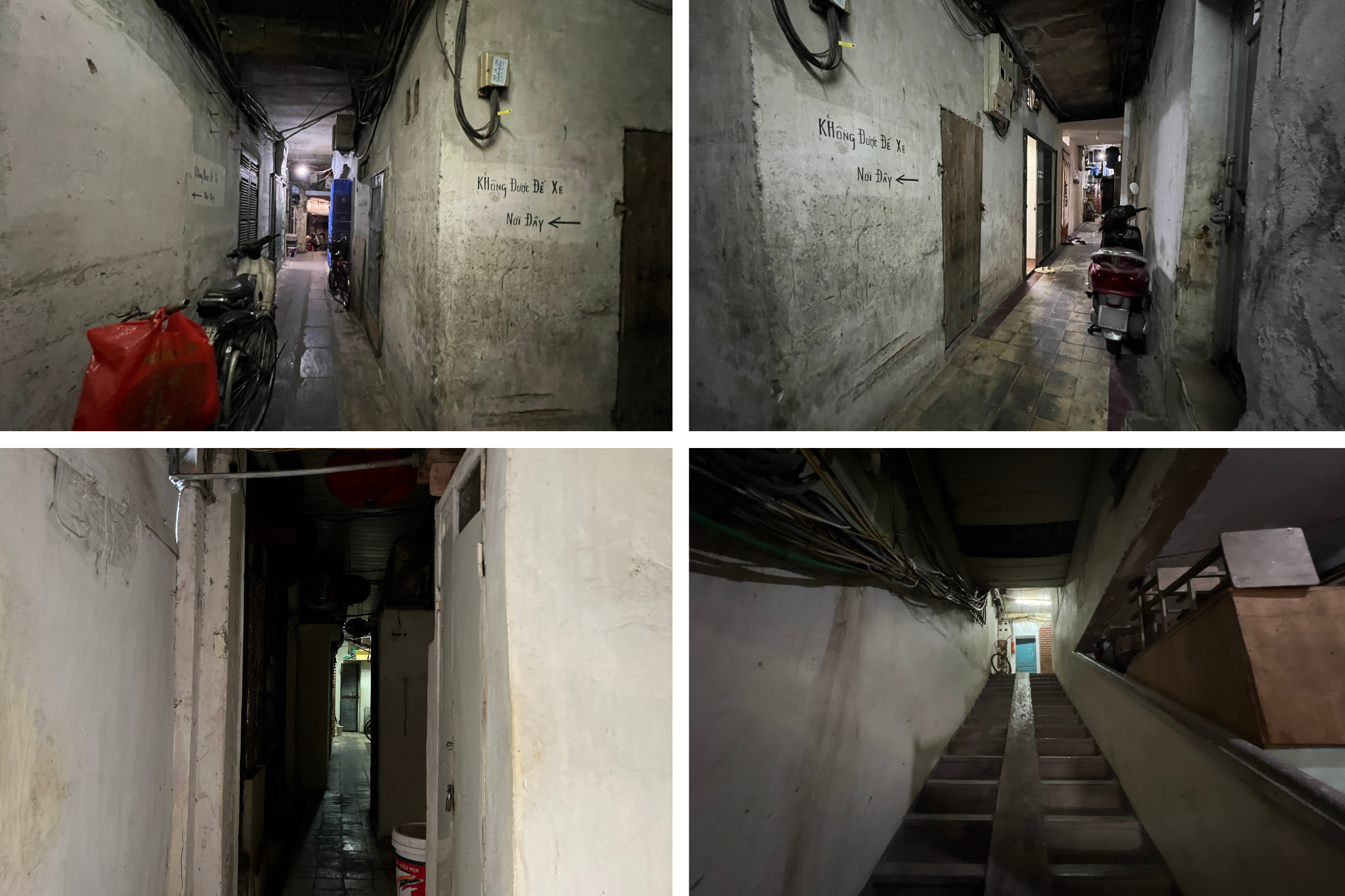 Cả khu có 4 tầng, mỗi tầng gồm 10 căn hộ rộng từ 6 - 24 m2 nhưng mỗi dãy chỉ có một nhà vệ sinh chung. Không gian sống chật chội, ẩm thấp, thiếu sáng từ hành lang đến các lối dẫn, cầu thang. Vì vậy, để tăng thêm diện tích sống, các gia đình phải tự vá víu, cơi nới thêm bếp ăn, nhà tắm.