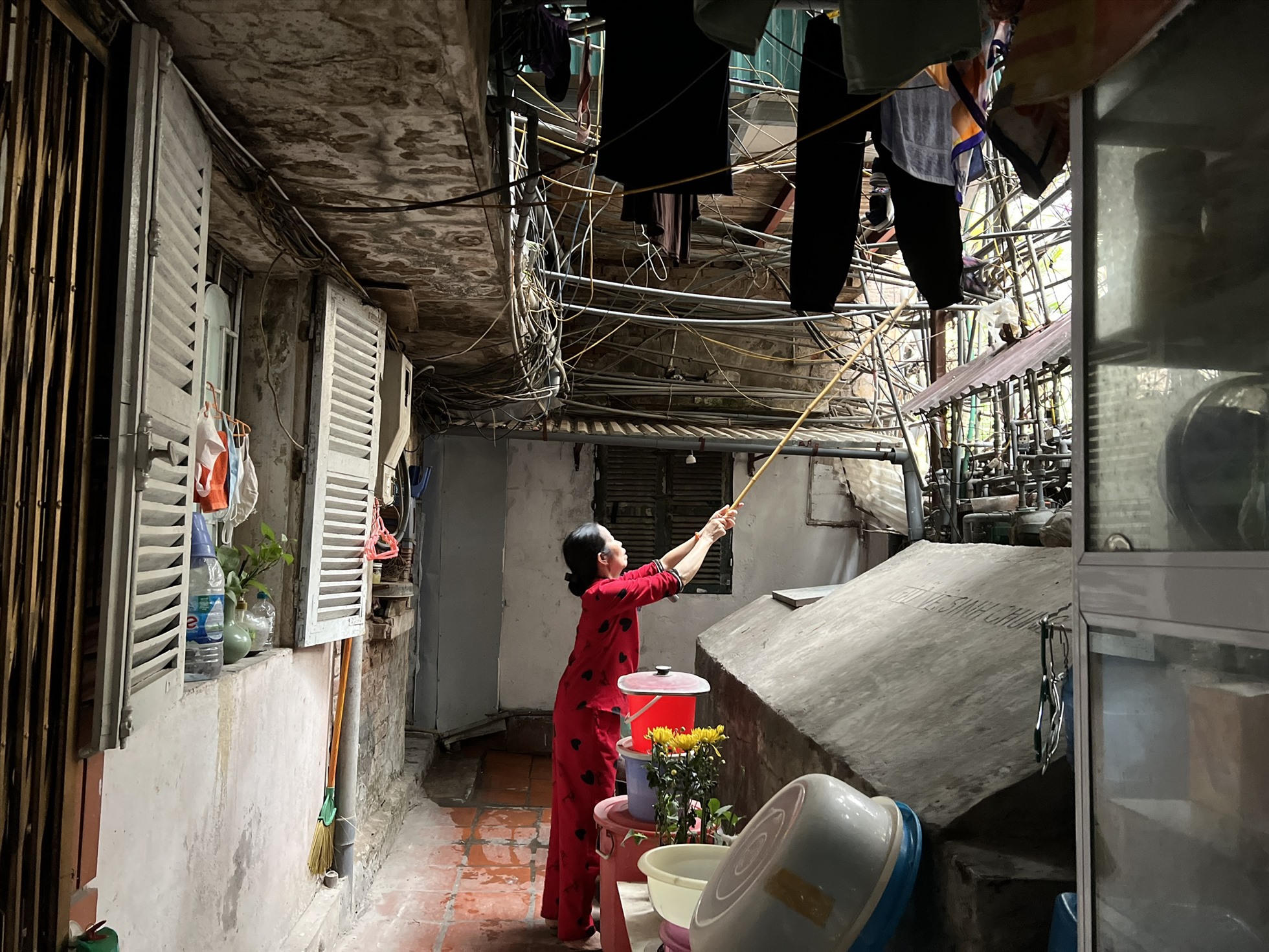 Khu nhà trở nên nhếch nhác và tối tăm hơn khi mọi không gian có ánh sáng lọt vào đều được người dân tận dụng để phơi quần áo.