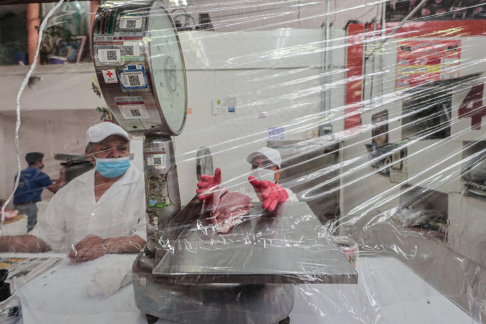 Phụ nữ đang cân thịt sau tấm màn nhựa ở Mexico City. Ảnh: Hector Vivas/Getty Images.