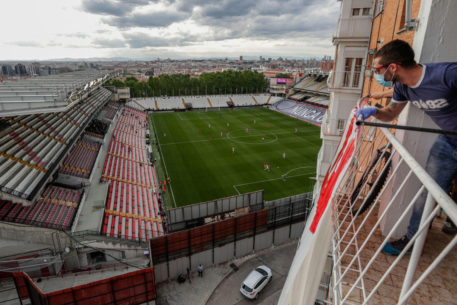 Một người hâm mộ bóng đá ở Madrid theo dõi trận đấu chuyên nghiệp giữa đội bóng Rayo Vallecano và Albacete. Ảnh: Manu Fernandez/AP.