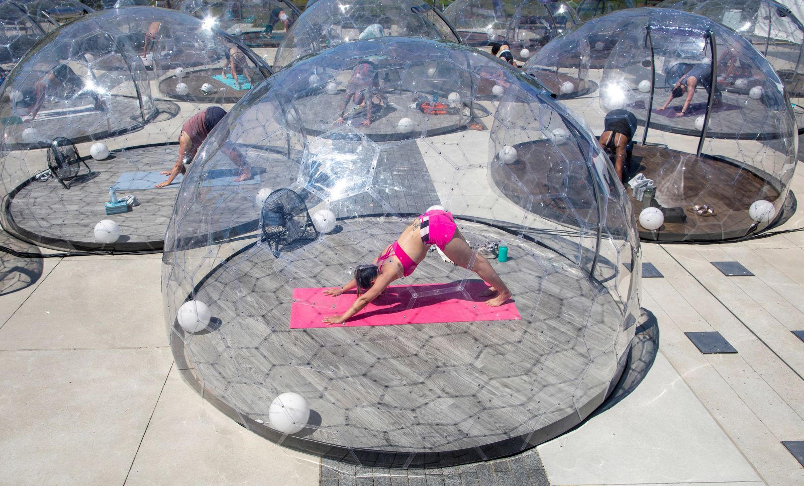 Mọi người tham gia lớp yoga ngoài trời ở Toronto, Canada. Ảnh: Carlos Osorio/Reuters.