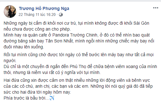 Sau một thời gian dài im hơi lặng tiếng khi bị quản thúc tại TP HCM để phục vụ cho công tác điều tra, Hoa hậu Trương Hồ Phương Nga đã gây khá nhiều bất ngờ khi chia sẻ hình ảnh ngồi trên máy bay kèm theo những lời tâm sự: “Những ngày bị cấm đi khỏi nơi cư trú, tụi mình không được đi khỏi Sài Gòn nếu chưa được công an cho phép.