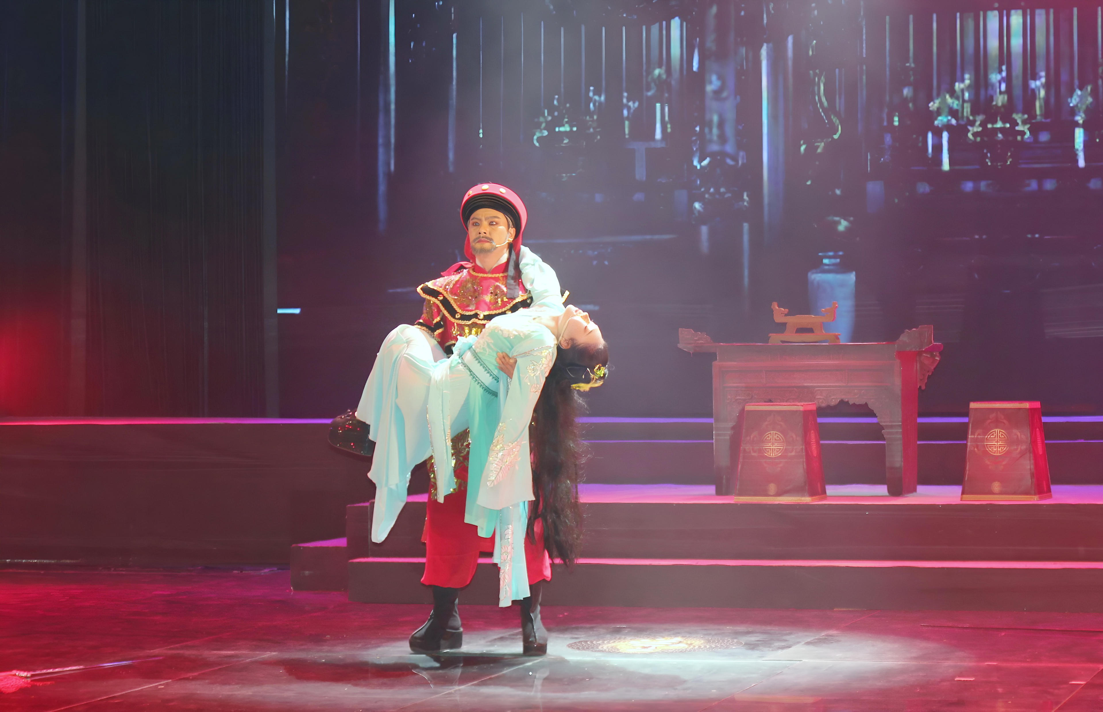 Sau lễ khai mạc, thí sinh Nguyễn Văn Dững (Nhà hát Cao Văn Lầu, Bạc Liêu) dự thi vai Trần Thặng trong trích đoạn Kẻ sĩ Thăng Long. |