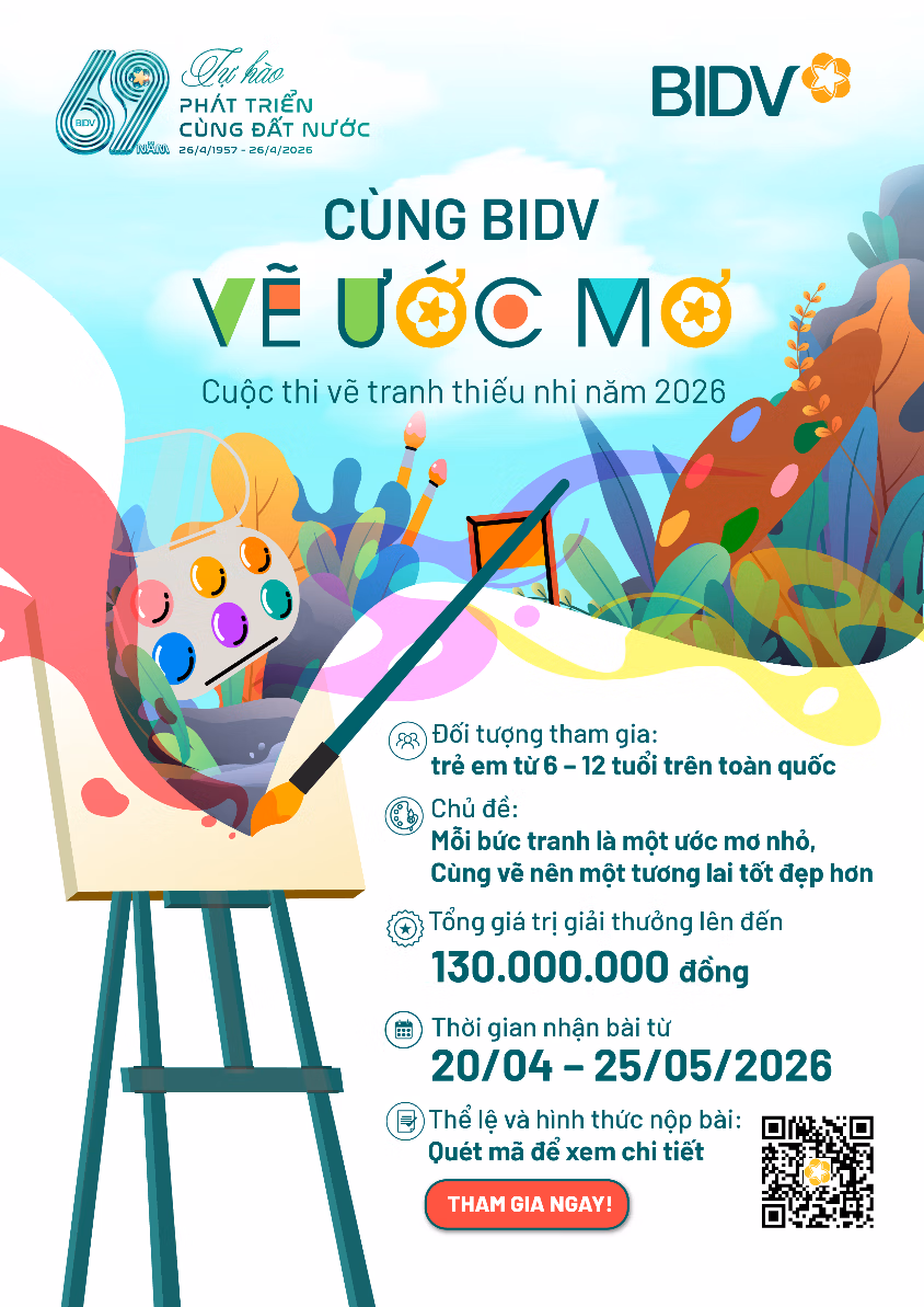 Hướng tới kỷ niệm 69 năm ngày thành lập Ngân hàng (26/4/1957 – 26/4/2026), Ngân hàng TMCP Đầu tư và Phát triển Việt Nam (BIDV) tổ chức Cuộc thi vẽ tranh thiếu nhi trên phạm vi toàn quốc.