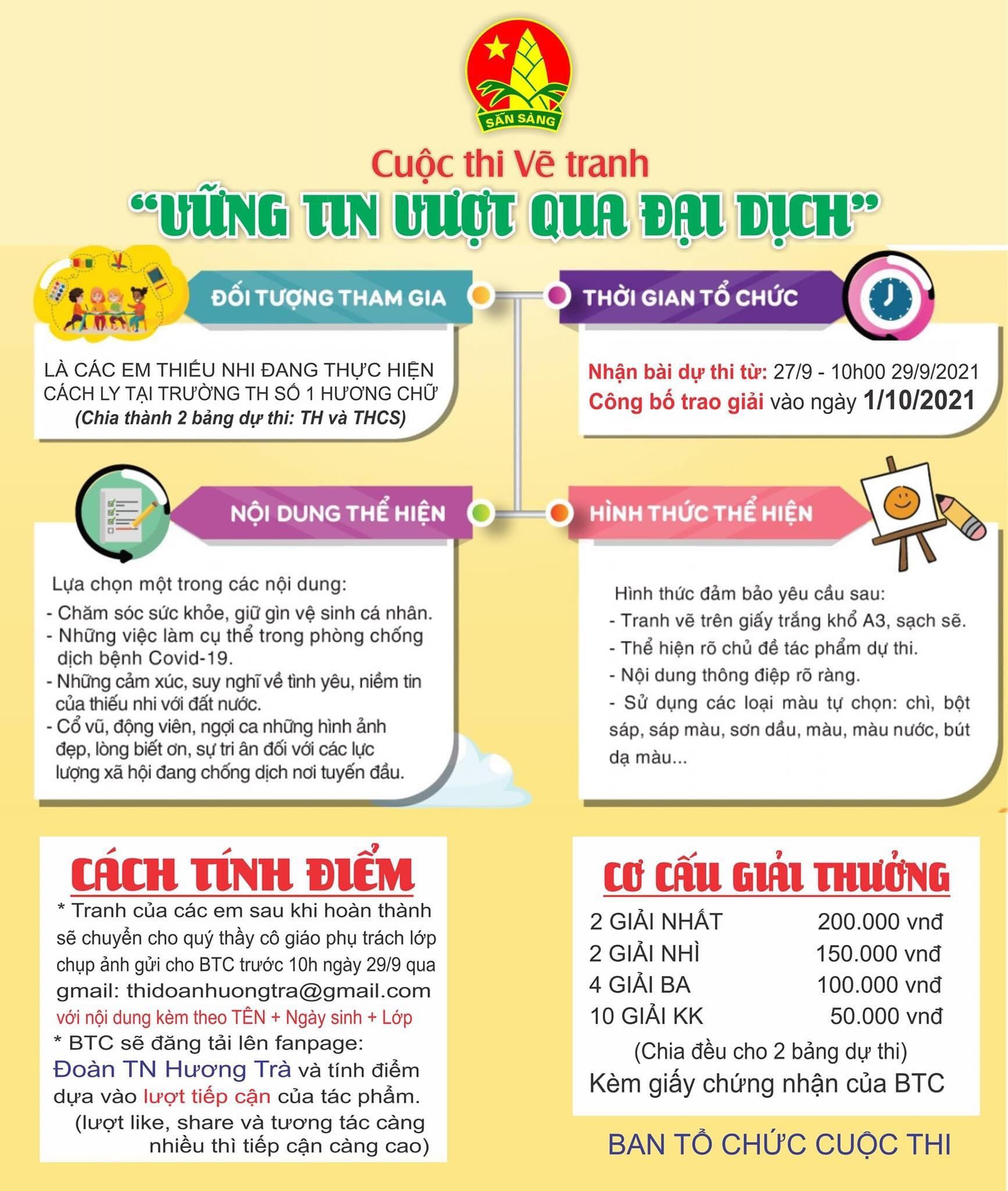 Tranh các em sau khi hoàn thành sẽ chuyển cho thầy cô giáo trong khu cách ly. Sau đó, thầy cô sẽ chụp ảnh gửi cho BTC. Tiếp theo BTC sẽ đăng trên trang Fanpage: “Đoàn TN Hương Trà” và tính điểm dựa theo lượt tiếp cận của tác phẩm.