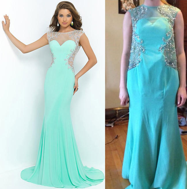 Thiết kế này ở hình minh họa có form đuôi cá nuột nà, đính kết chỉn chu, còn bộ đầm mà khách nhận được không có chút đường cong nào, còn cách đính cườm quả đúng là thảm họa!