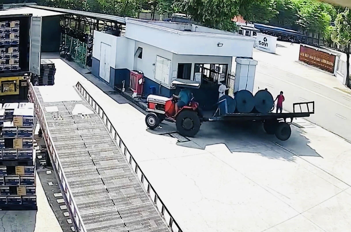 Theo hình ảnh từ camera an ninh, ngày 19/3, chiếc xe kéo chở hàng di chuyển từ ngoài đường vào một công ty trong KCN Mỹ Phước 3, phường Mỹ Phước, TP Bến Cát. Lúc này, nam bảo vệ đang đứng ở cổng. Khi xe chạy qua, ba cuộn hàng bất ngờ rơi xuống, đè trúng người bảo vệ.