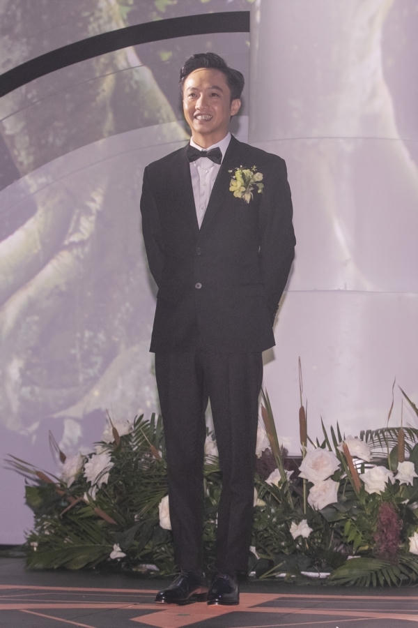 Doanh nhân 37 tuổi gửi lời cảm ơn đến bố mẹ hai bên, đặc biệt là mẹ vợ đã đồng ý gả con gái cho anh. Gương mặt anh lộ rõ sự xúc động trong giây phút quan trọng ghi dấu tình yêu. Đàm Thu Trang liên tục xoa lưng động viên chồng trên sân khấu.