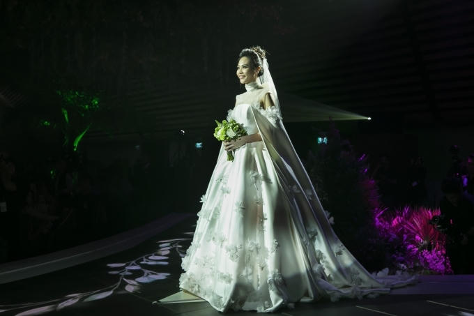 Đàm Thu Trang diện váy cưới phom dáng công chúa khi bước vào sân khấu tổ chức hôn lễ với doanh nhân Cường Đôla, tối 27/8 tại TP HCM.