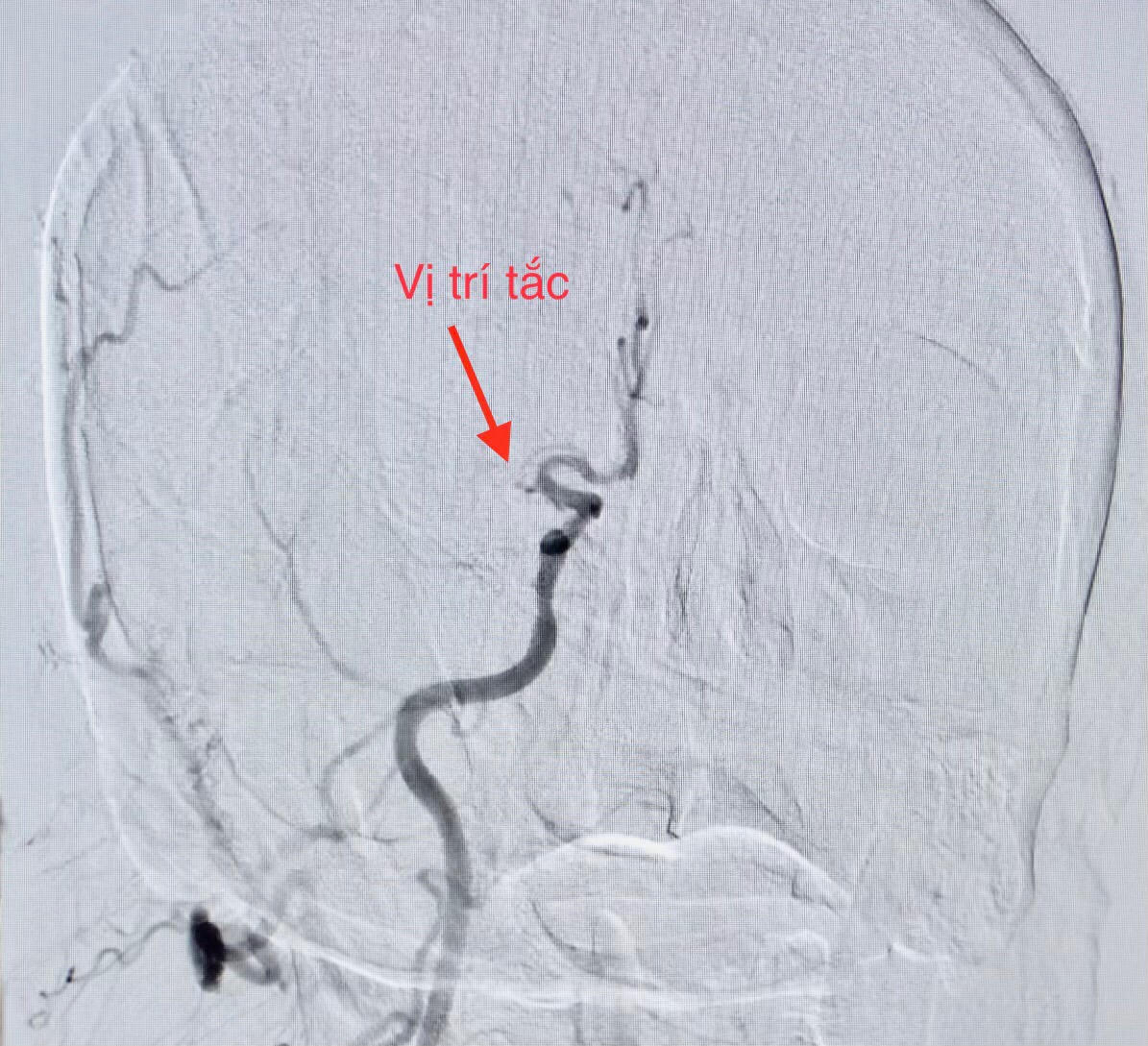 Thời điểm chuẩn bị đặt ống thông để can thiệp mạch vành, bệnh nhân liệt nửa người bên trái và nói đớ. Nhận định đây là một trường hợp hiếm gặp phối hợp giữa nhồi máu cơ tim cấp (do tắc động mạch vành) và nhồi máu não cấp (do tắc một mạch máu ở não), ê-kíp can thiệp mạch máu não lập tức được báo động để cùng phối hợp điều trị cho bệnh nhân. Kết quả CTscan não đúng như chẩn đoán.