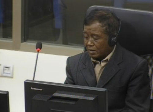 Cựu binh Khmer Đỏ Chhun Samorn tại phiên tòa ngày 28/6/2016 ở Phnom Penh. Ảnh:CambodiaTribunal. |