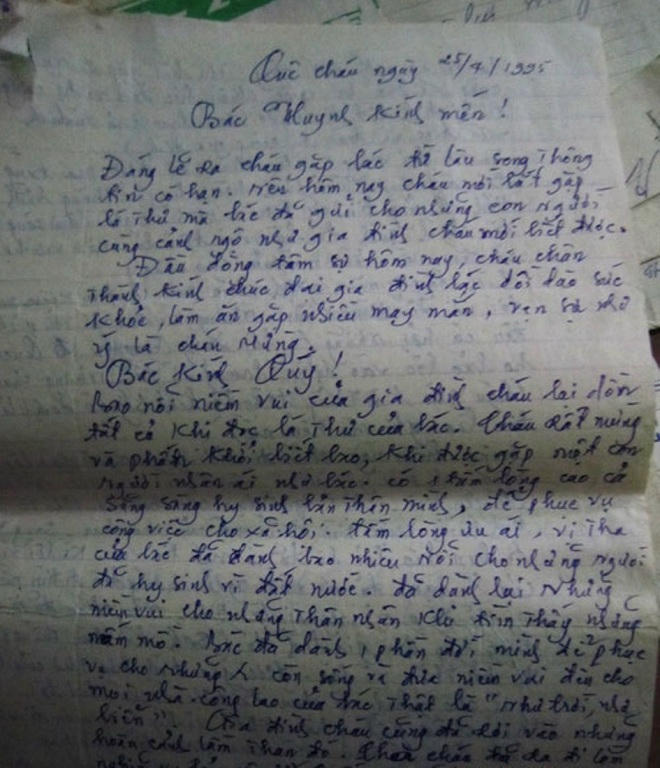Nhưng có lẽ với người cựu chiến binh ấy, món quà quý giá hơn cả là hàng trăm bức thư người thân liệt sỹ từ khắp nơi gửi về tri ân. Với ông, mỗi lần mở thư ra đọc là lại nghẹn lại vì hạnh phúc. Trong số hàng trăm bức thư ấy, ông Huynh ấn tượng với những dòng tâm tình của ông Nguyễn Văn Quảng, (ngụ xã Quỳnh Xuân, huyện Quỳnh Lưu, Nghệ An), em trai liệt sỹ Nguyễn Văn Thư.
