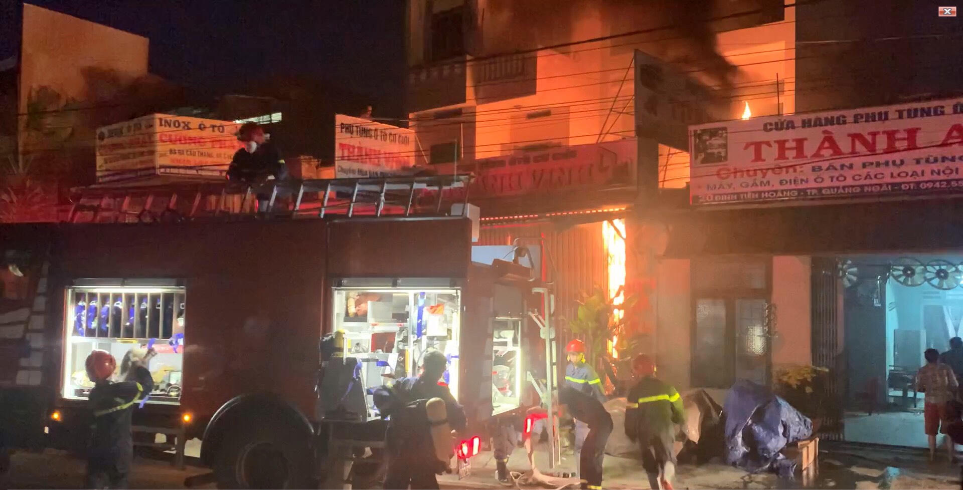 Tiếp nhận được thông tin, lực lượng Cảnh sát Phòng cháy chữa cháy và cứu nạn cứu hộ Công an tỉnh Quảng Ngãi đã nhanh chóng huy động lực lượng có mặt tại hiện trường và kịp thời cứu được 2 nạn nhân là ông Nguyễn Văn V (46 tuổi) và con trai là Nguyễn Văn Quốc Th (13 tuổi) đang bị mắc kẹt trên sân thượng tòa nhà 3 tầng xuống, đưa ra ngoài đi cấp cứu.
