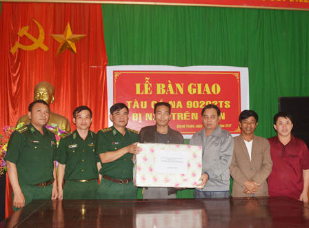 Chiều 27/4, tại đồn biên phòng Quỳnh Thuận, BĐBP Nghệ An đã phối hợp với chính quyền địa phương xã Sơn Hải huyện Quỳnh Lưu tiến hành bàn giao ngư dân và tàu bị nạn, tặng quà động viên các ngư dân trên tàu cá gặp nạn.