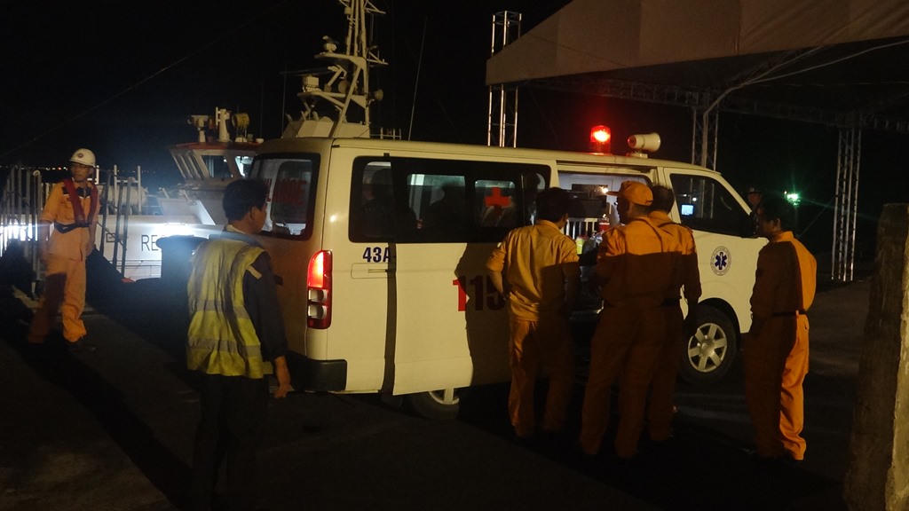 Đến14h45 cùng ngày, lực lượng cứu nạn đã tiếp cận tàu QNa 92950 TS, bác sỹ và các nhân viên cứu nạn nhanh chóng chuyển nạn nhân lên tàu cứu nạn thực hiện cấp cứu nạn nhân. Qua thăm khám, bác sỹ tàu cứu nạn của Trung tâm xác định nạn nhân bị chấn thương vùng mặt, gãy xương hai cánh tay do tời quấn, nghi ngờ gãy xương sườn số 6 và 7 bên trái, tình trạng hết sức nguy hiểm. tàu cứu nạn lập tức khẩn cấp đưa nạn nhân về đất liền.