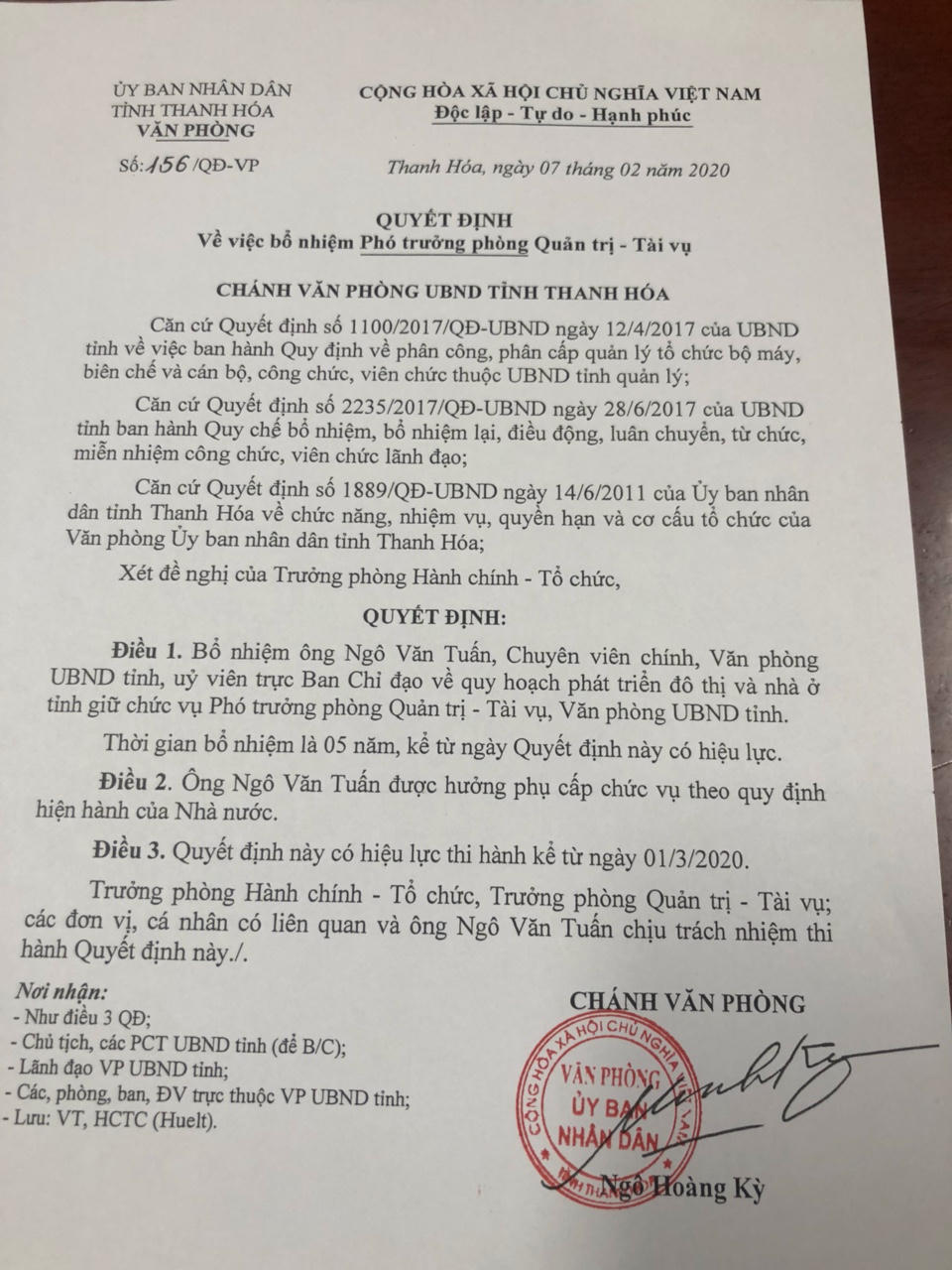 Theo Quyết định, ông Ngô Văn Tuấn được bổ nhiệm giữ chức Phó Trưởng phòng Quản trị tài vụ, Văn phòng UBND tỉnh Thanh Hoá, từ ngày 1/3.