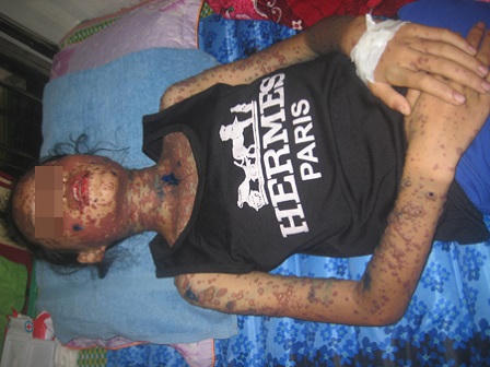 Trước đó, vào ngày 30/8, Khoa Lây - Truyền nhiễm, Bệnh viện Sản - Nhi Nghệ An tiếp nhận bệnh nhân K.T trong tình trạng bị nổi các bỏng nước toàn thân, các hốc tự nhiên như mắt, mũi, miệng, tai bị bỏng ban và bong ra, chảy nước, toàn thân lở loét, bong da như bị bỏng vôi. Các điểm bỏng sâu dưới mặt da, li bì, sốt cao liên tục và bị rối loạn tinh thần.