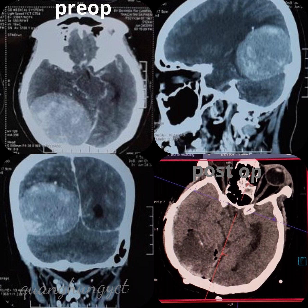 Qua chẩn đoán và chụp CT sọ não, bác sĩ phát hiện bệnh nhân có khối u vùng chẩm phải rất lớn với kích thước 57.5mm x 69.6mm x 66.2mm. Khối u lành tính nhưng do kích thước lớn, bám vào những vị trí dễ chảy máu và được cấp máu bởi nhiều mạch máu nuôi nên điều trị rất khó.