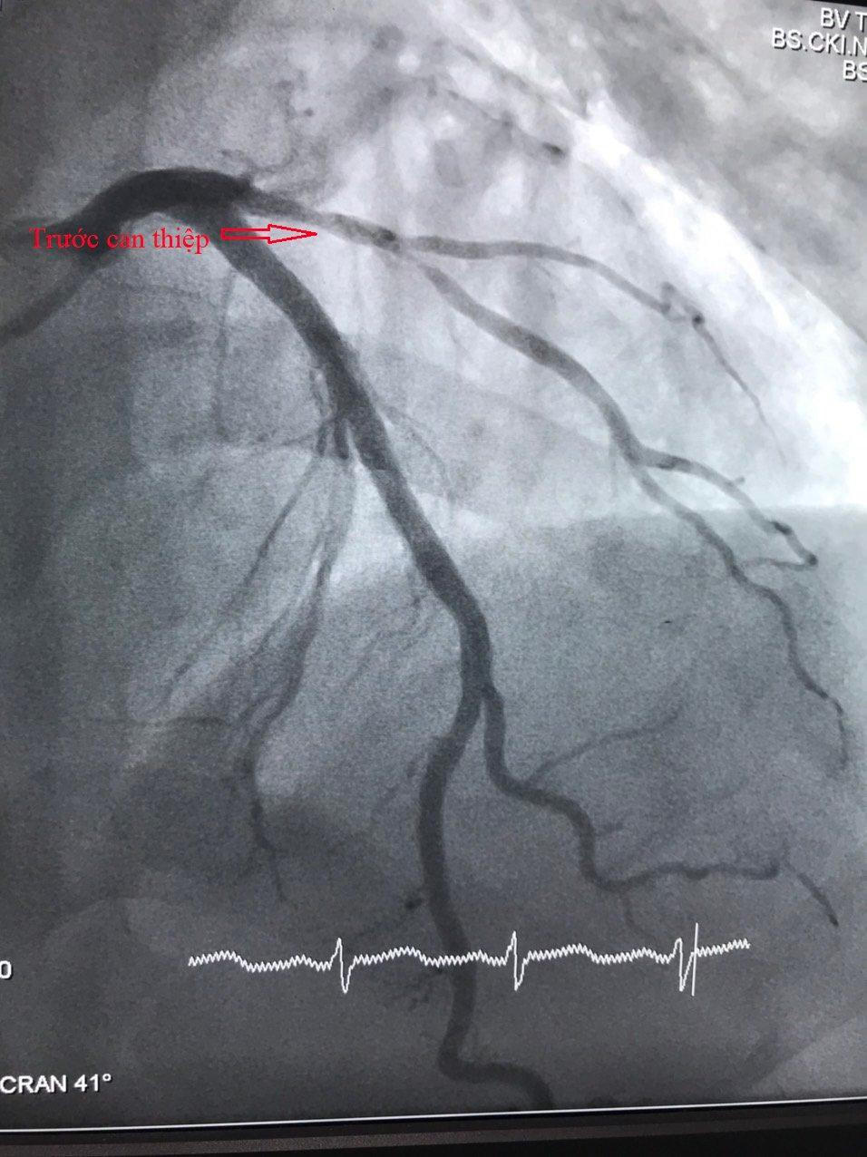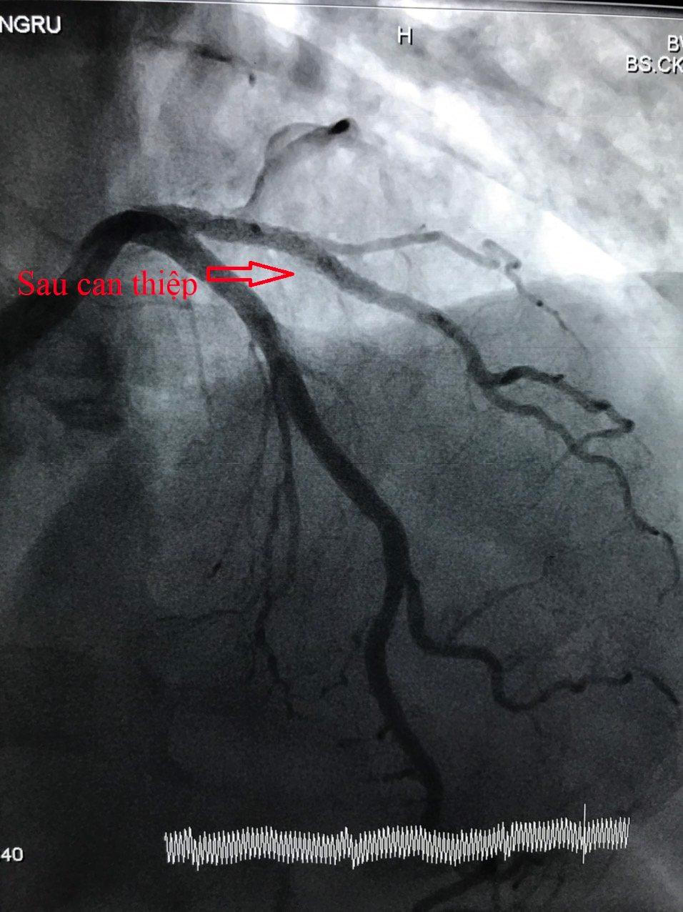 Kết quả chụp mạch vành ghi nhận động mạch liên thất trước (LAD) bị thâm nhiễm, hẹp 80%-90% nhánh chéo 1, các bác sĩ tiến hành can thiệp mạch vành cho bệnh nhân bằng cách nong bóng và đặt stent phủ thuốc với thời gian 30 phút.