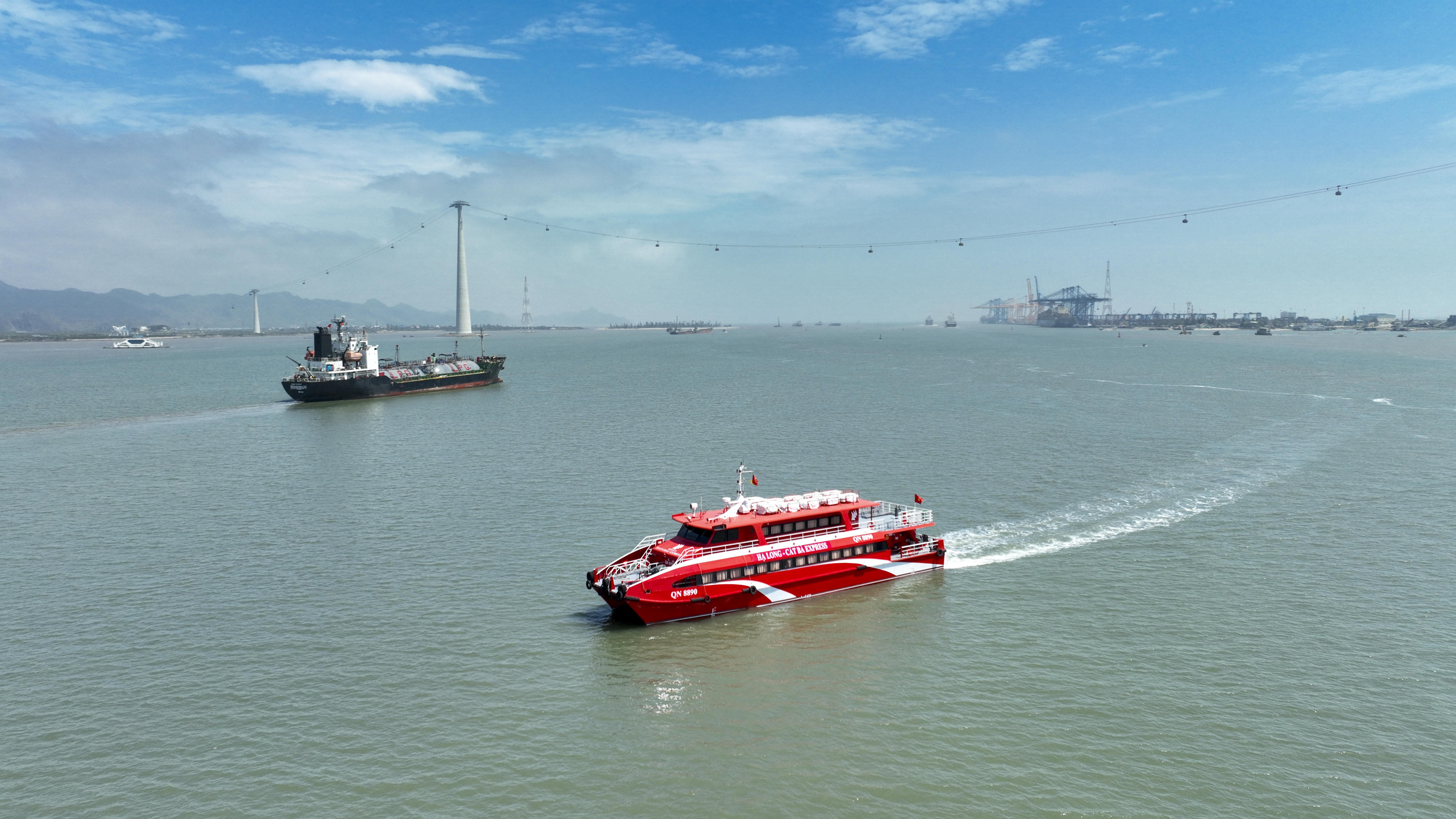 Bến tầu cao tốc Hadeco- với tàu 2 thân màu đỏ, có sức chứa 242 hành khách từ Cát Hải đến thị trấn Cát Bà với mức giá 180.000 đồng, khai trương từ ngày 18/4/2025. |