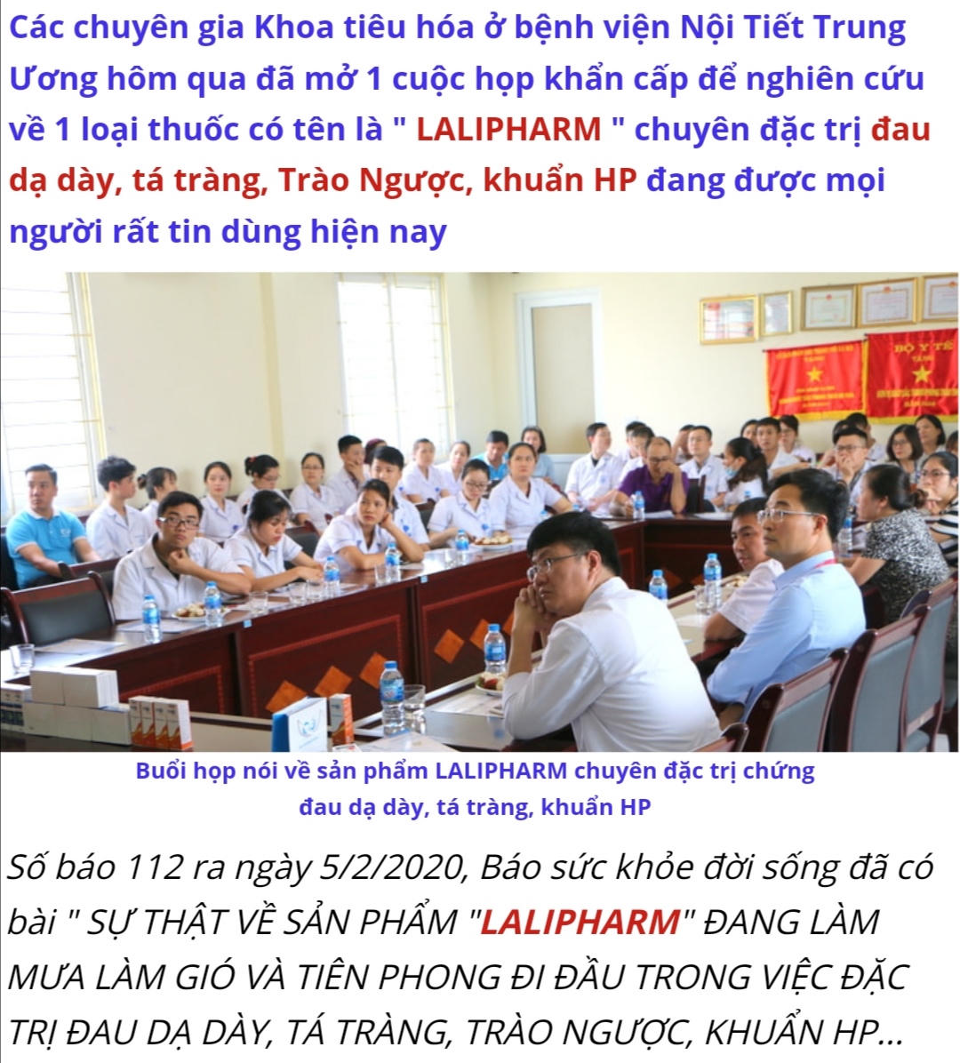 Sự lố lăng còn được đẩy lên “cao trào” khi những lời quảng cáo khẳng định: “Các chuyên gia Khoa tiêu hóa ở bệnh viện Bạch Mai Hà Nội hôm qua đã mở một cuộc họp khẩn cấp để nghiên cứu về 1 loại thuốc có tên là " LALIPHARM " chuyên đặc trị đau dạ dày, tá tràng, khuẩn HP đang được mọi người rất tin dùng hiện nay”, đính kèm với đó là một tấm ảnh với rất nhiều y, bác sỹ đang lắng nghe trong một cuộc hội thảo để minh họa.